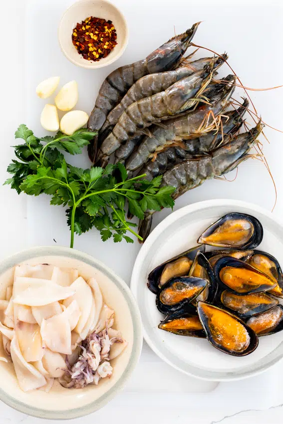 - Seafood. I used prawns/shrimp, calamari, baby squid and mussels. Clams, scallops, lobster, cubes of white fish and imitation crab meat can also be used.