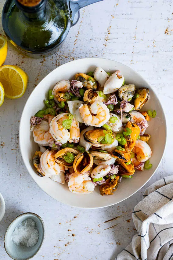 This seafood salad recipe is absolutely delicious! Poached seafood in a zesty lemon marinade is an easy, healthy appetizer or protein-packed lunch.