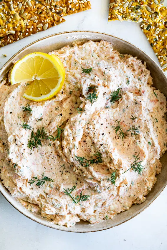 Creamy smoked salmon dip with dill, chives and fresh lemon is the perfect appetizer served with crackers or crusty bread.