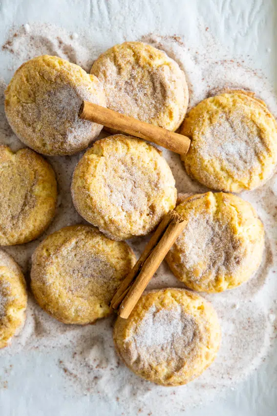 - Place the snickerdoodle dough balls on sheet pans/cookie sheets lined with parchment paper then bake for 10-12 minutes until lightly golden brown. You might think the cookies are not properly baked through but underbaking will give you a softer cookie, exactly what we’re looking for.