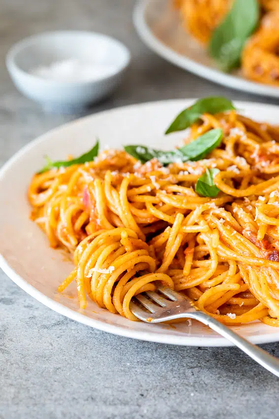 Dinner recipes don’t come easier than this spicy tomato bacon pasta. It’s the perfect recipe for when you need a delicious plate of pasta, FAST!