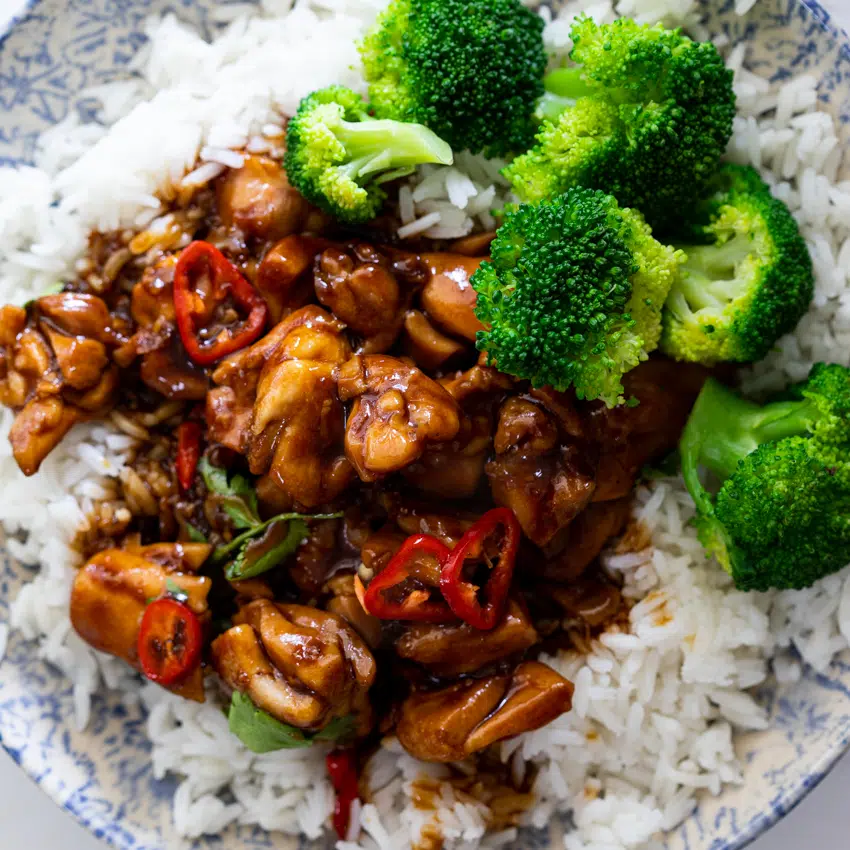 - Serve: Serve the chicken and sauce over rice (or noodles) with greens of your choice. Scatter with sliced chillies and cilantro/coriander (or sliced spring onions) and serve.