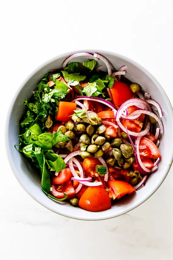 Easy tomato salad with capers, herbs and a simple lemon olive oil dressing is the perfect way to use juicy, ripe tomatoes.