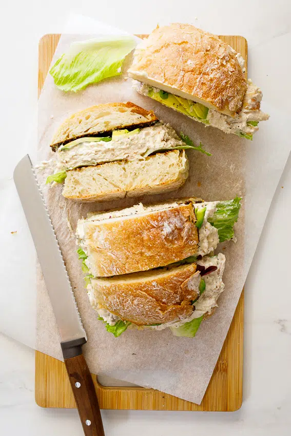 - Assemble the sandwich: Slice a ciabatta or other loaf of your choice down the center. Drizzle with olive oil or brush with melted butter then toast in a large, hot pan until golden brown. Top the bottom piece of bread with a layer of lettuce. Pile on the chicken salad and top with sliced avocado. Season with salt and pepper then top with the remaining bread. Slice into portions and serve.
