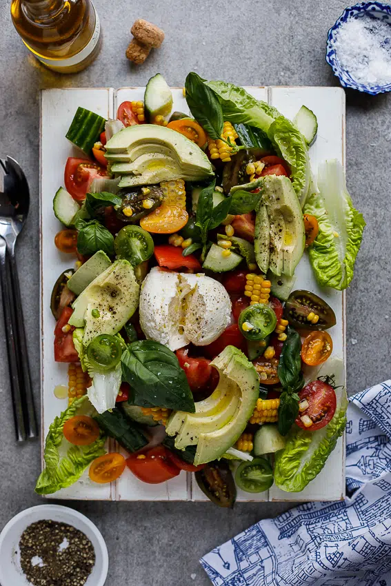 Anyway, over the weekend when I did my meal planning for the week, I had a serious craving for a super fresh farmers market salad abundant with fresh produce. And yes, most people wouldn’t have access to seriously good fresh produce in winter but luckily for us, we have very mild winters and we still have access to pretty good tomatoes, corn, etc. in winter.