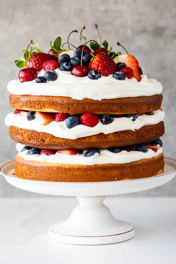 - Assemble and decorate the cake: Layer the cooled lemon vanilla cakes with the sweetened whipped cream and berries. I used raspberries, sliced strawberries and blueberries in the layers and added fresh cherries to the top. Blackberries and gooseberries can also be used.