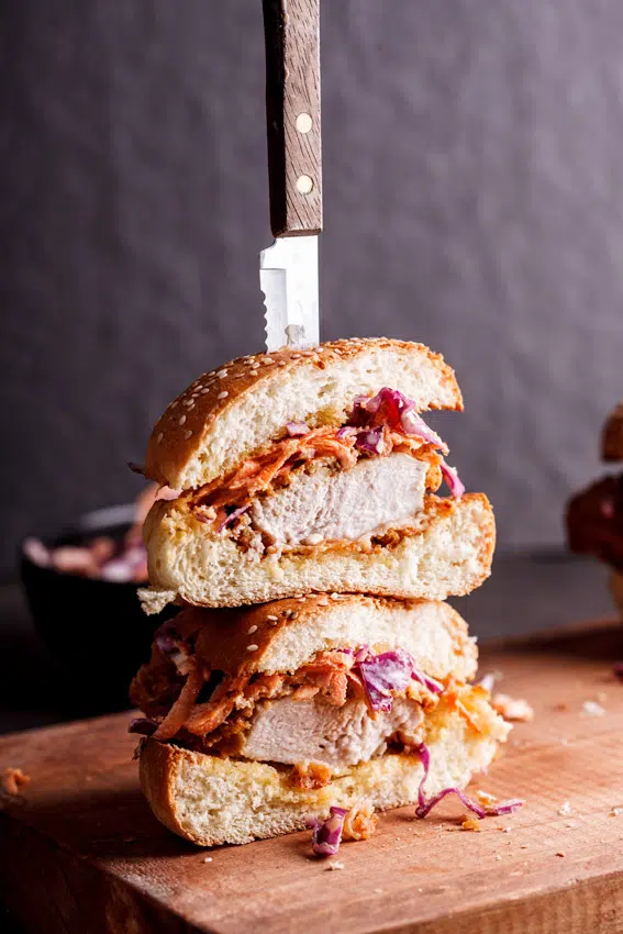 First of all: Fried chicken. Who can say no to a piece of juicy, tender chicken encased in a crisp coating? I used the same recipe I did for my Crispy Juicy Fried Chicken, I just used boneless chicken breasts instead of chicken pieces. It’s important to keep the skin on the breast though. The skin gives the chicken more flavour but also allows the coating to stick better. Pair this with creamy coleslaw and a buttered brioche roll and you have sandwich nirvana. Simple and delicious.