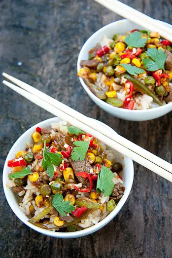 - Stir fry the rice and beef together for a minute and serve with fresh coriander/parsley and an extra squeeze of lime juice.