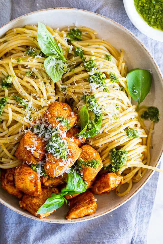 This garlic butter chicken pesto pasta recipe with juicy chicken bites cooked with paprika, lemon and garlic is a delicious, easy dinner idea.