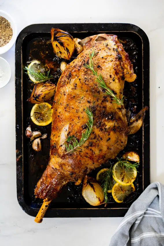 The lamb can be seasoned, placed in a roasting dish and covered with foil then refrigerated overnight. The roasted lamb can be kept covered with foil and a few tea towels at room temperature for up to 2 hours before serving – it will keep warm for quite some time. Leftovers can be kept in the fridge in an airtight container for up to 3 days. Ps. Sliced leg of lamb makes the best sandwiches!