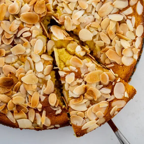 - Bake: Transfer the batter to a lined springform cake pan (23cm/9inch). Scatter over the flaked almonds then place in a preheated oven. Allow to bake for 50-60 minutes or until the cake is golden brown and a skewer inserted comes out clean. Remove from the oven and allow to cool completely before slicing and serving.