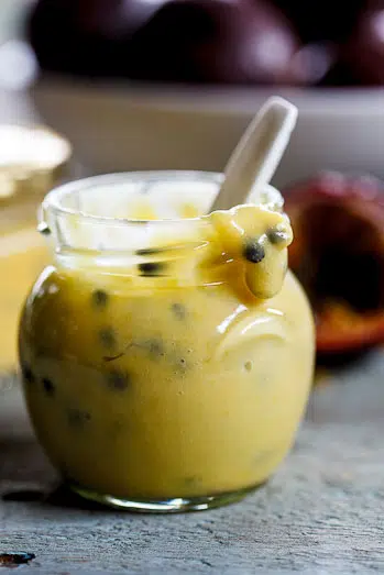 I’ve made this recipe several times, and it always turns out amazing! We have several passion fruit vines in our yard, and this is a wonderful way to keep the incredible flavor of passion fruit but turn it into a more useful product (for my family at least!) We eat this curd with greek yogurt, on vanilla ice cream, and with cheesecake! We also make a bunch and give it away as gifts! Excellent recipe!