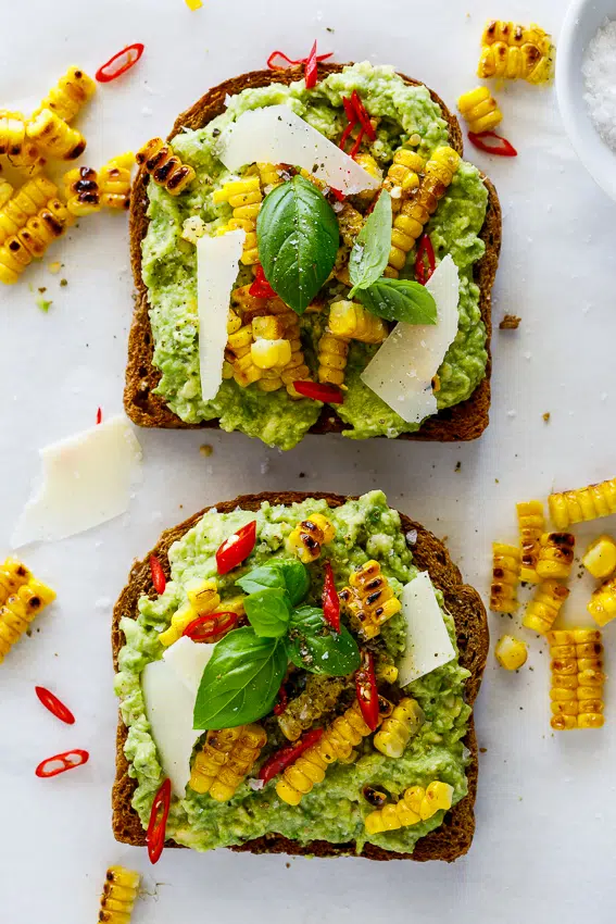 - Prepare the corn: Boil corn on the cob in a large pot of salted water for 10 minutes. Drain then brush with oil. Grill the corn in a griddle pan or an outdoor grill until caramelized and golden on all sides. Slice the grilled corn off of the cobs then top the avocado toast. Add sliced chillies, fresh basil leaves and cheese (if using). Season with salt and pepper then serve.