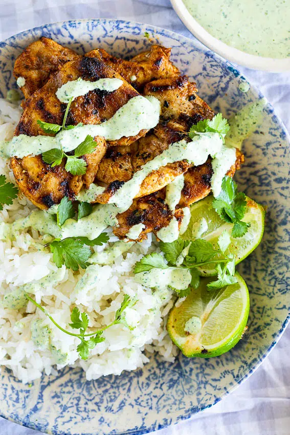 - Serve the chicken over cooked rice with a generous drizzle of the green sauce with lime wedges and extra coriander/cilantro