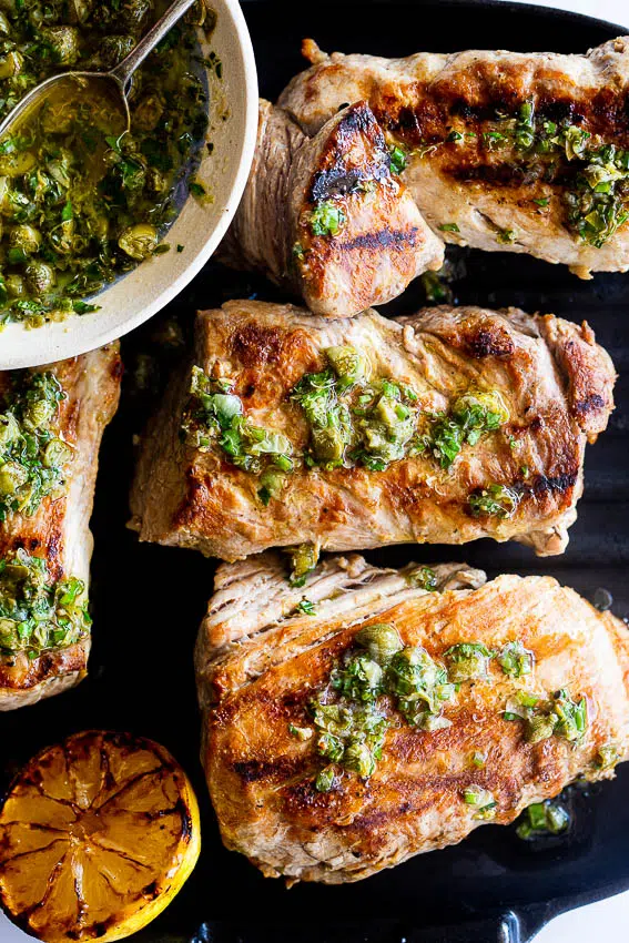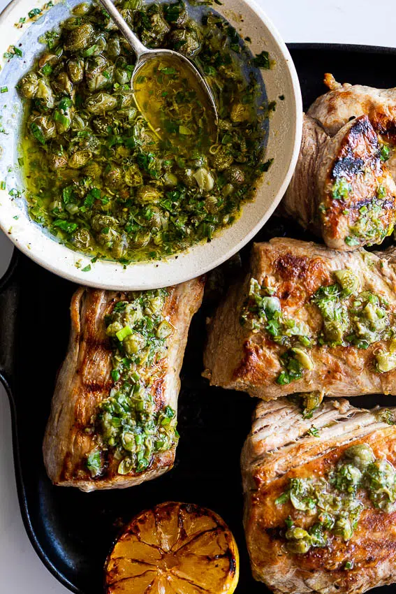 Pork tenderloin/pork fillet is a fantastic economical source of protein and is so delicious when grilled until golden brown and juicy on the inside. Because it’s a relatively bland cut of meat, it’s perfect served with a punchy sauce to add flavor. My lemon caper sauce recipe is my go-to when I need to serve a sauce alongside meat but don’t want anything too rich or creamy. Inspired by chimichurri, the sauce is packed with fresh herbs, capers and lots of lemon juice making it the perfect addition to grilled meat.