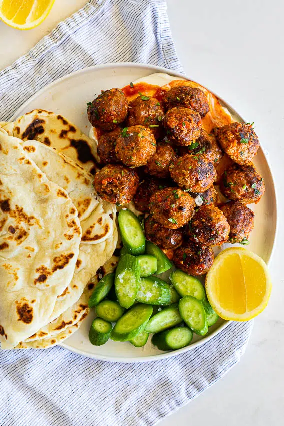 These lamb meatballs flavored with homemade harissa paste are aromatic, juicy and just a little spicy. They are perfect for dinner served with flatbread, yogurt sauce and sliced cucumber.