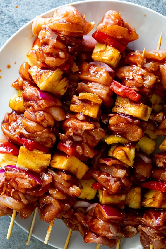 The marinade/glaze consists of a few pantry staples combined to make a delicious sticky, almost bbq sauce-like sauce. The skewers are made with chicken, pineapple. red onion and red bell pepper but green or yellow peppers can also be used.