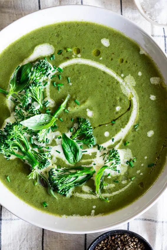 Simmer for another 5-10 minutes until tender. Blend until smooth. If the vegetables have lost some of their vibrancy while cooking, adding a few handfuls raw spinach and basil leaves right before blending will bring the color back to the soup. Pour in the cream (if using) and season with salt and pepper. Serve sprinkled with fresh herbs.