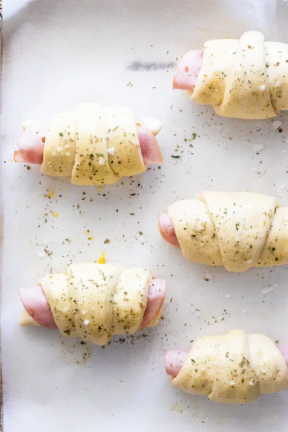 Transfer the dough to a greased bowl and cover with plastic wrap. Allow to rise for an hour in a warm spot. Roll the dough out onto a floured surface into a large rectangle. Cut the dough into long triangles, similar to how you would cut croissant dough. Place a piece of ham and mozzarella onto the wide side of the dough then roll up to the pointy side of the dough. Tuck the point in and place the rolls onto a sheetpan lined with parchment paper. Cover loosely with plastic wrap and allow to rise for 30 minutes. Brush with egg then sprinkle with dried herbs and salt. Bake for 10-15 minutes until the rolls are golden brown and baked through. Remove from the oven and allow to cool for 5 minutes before serving.