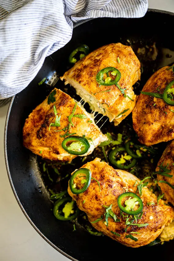 Jalapeño Popper Chicken with cream cheese and mozzarella is the kind of dinner recipe your family will drool over. Easy to make and quick to cook plus who can say no to a cheese pull?
