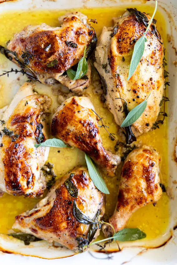 - Chicken. I used a whole chicken, broken down, but you can use chicken leg pieces (the thigh and drumstick attached), breast on the bone or chicken thighs for this. Leaving the chicken whole is also fine, pieces just roast quicker making it more suitable for weeknight dinners.