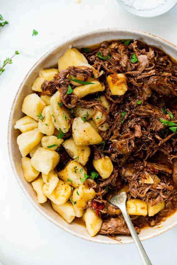 - Make the ragu: In a large pot/Dutch oven set over medium heat, sauté onion and garlic until fragrant then stir in the tomatoes, a few tablespoons of tomato paste, herbs, red wine and the shredded lamb and cook for 25-30 minutes until the sauce has reduced slightly. Season to taste and serve with gnocchi or pasta of your choice (pappardelle pasta is fantastic with ragu) and a generous amount of grated Parmesan cheese.