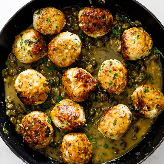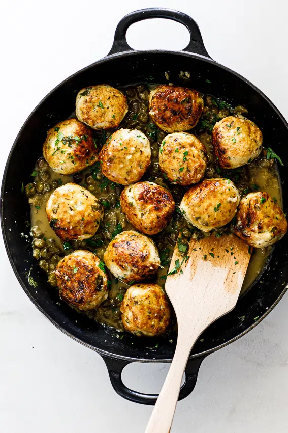 - Make the Piccata sauce: Add the butter to the pan then the garlic. Cook for 30 seconds then pour in the wine and/or stock. Stir in the parsley, capers and fresh lemon juice. Bring to a simmer then add the meatballs back in to the pan. Cook for 5-7 minutes, swirling the meatballs in the sauce regularly until the sauce is slightly reduced and the meatballs are cooked through.