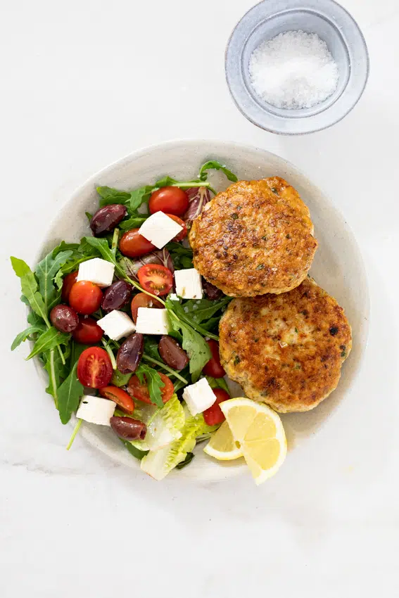 Juicy chicken patties flavored with lemon zest and Parmesan. A delicious, healthy dinner option served with salad or as burgers with all your favorite toppings.