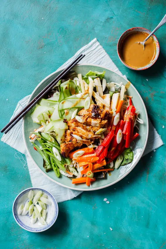 And for now, I’m giving you this insanely delicious salad I made a week or so ago. It was one of those nights where I had been shooting all day and I just had no energy to cook dinner. Luckily I had a surplus of chicken breasts in the fridge and I knew a quick salad would have to suffice. I wanted punchy flavour though so I made a quick satay dressing/marinade and marinated the chicken in it while I went to work slicing the vegetables.