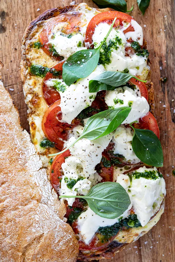 This Caprese sandwich is the easy lunch of my dreams. Not only is it perfect for feeding my family but it literally takes 5 minutes for me to prep before the whole thing goes into the oven. The cheese melts, the tomato gets a little roasty and finished with a quick basil pesto, fresh fior di latte (or buffalo mozzarella), it’s the kind of sandwich you will be craving for days to come!