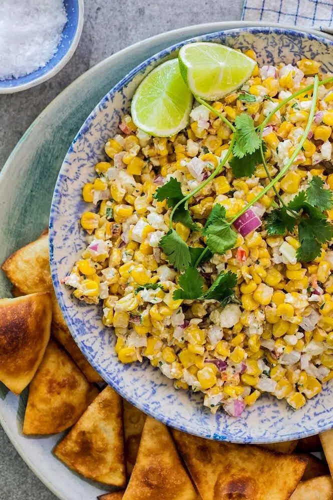 - Serve the Mexican street corn dip with tortilla/corn chips and extra lime for squeezing.