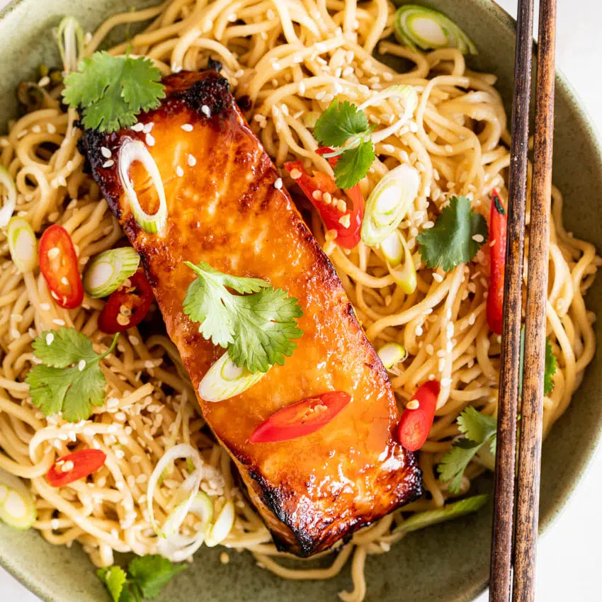 - Cook the salmon: Transfer the salmon to a parchment or foil lined baking dish. Bake for 7-10 minutes until the salmon is caramelized and just cooked. Remove from the oven then serve over the noodles with coriander/cilantro, sesame seeds, spring onion and chillies.