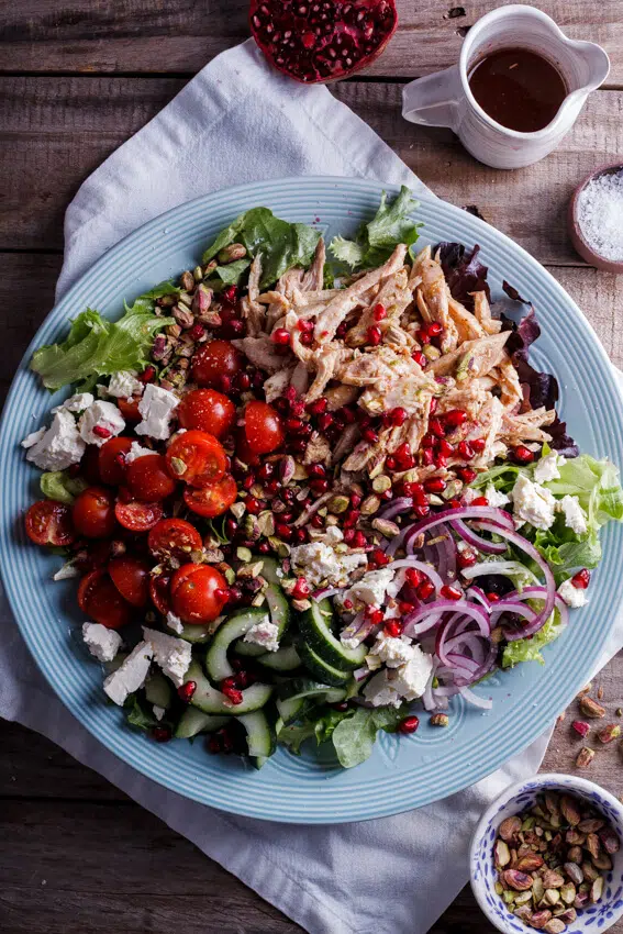 Leftover roast chicken is perfect used in this aromatic Moroccan chicken salad recipe. Juicy cherry tomatoes, crisp cucumber, pistachios and pomegranate rubies along with a spiced, fragrant dressing take this lunchtime staple to a whole other level.