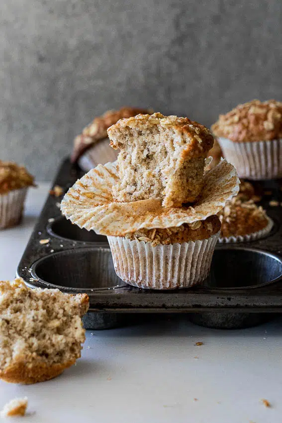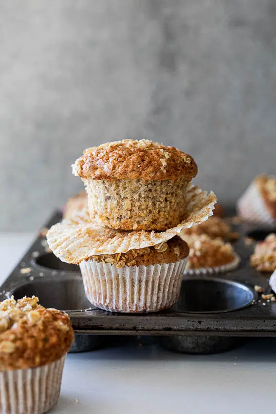 This banana nut muffin recipe super easy and you only need a few pantry staples to make the batter. I used all purpose flour but you could swop out half the flour for oat flour or wholewheat flour. Rolled oats add great texture and a bump of nutrition. As does the walnuts and seeds. The seeds are optional but I like the texture they add to the muffin batter. You could also fold in a cup of chocolate chips for added deliciousness (chocolate also brings out the most of the banana flavors) I topped the muffins with a simple oat-crumble mixture but this is also optional.