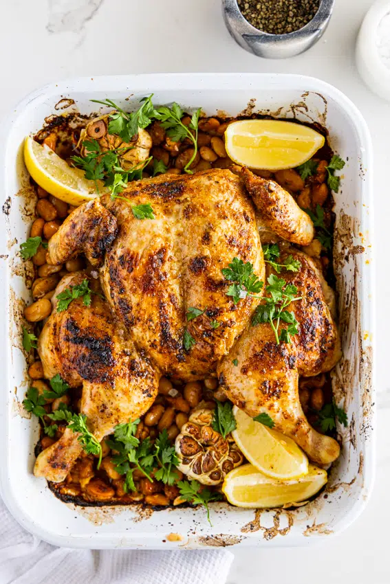We all love dinner recipes that require minimal washing up, right? This one pan chicken with beans is exactly the recipe your weeknight needs. The chicken is roasted on a bed of butter beans and aromatics all in a single pan for the ultimate convenience.