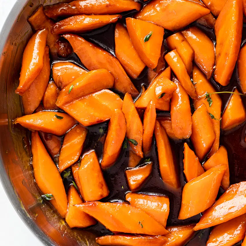 This is a level-up from the carrots I used to cook our family when I was a teenager. I have always loved glazed carrots but these are SO much better than the overly sweet, mushy carrots from my childhood. These brown sugar carrots are simmered in butter, orange juice and brown sugar with thyme until they are fork tender (no mushy carrots, please!) before being seasoned with salt and pepper. It’s the perfect side dish for Thanksgiving or Christmas and makes everyday dinners just that little bit more special.