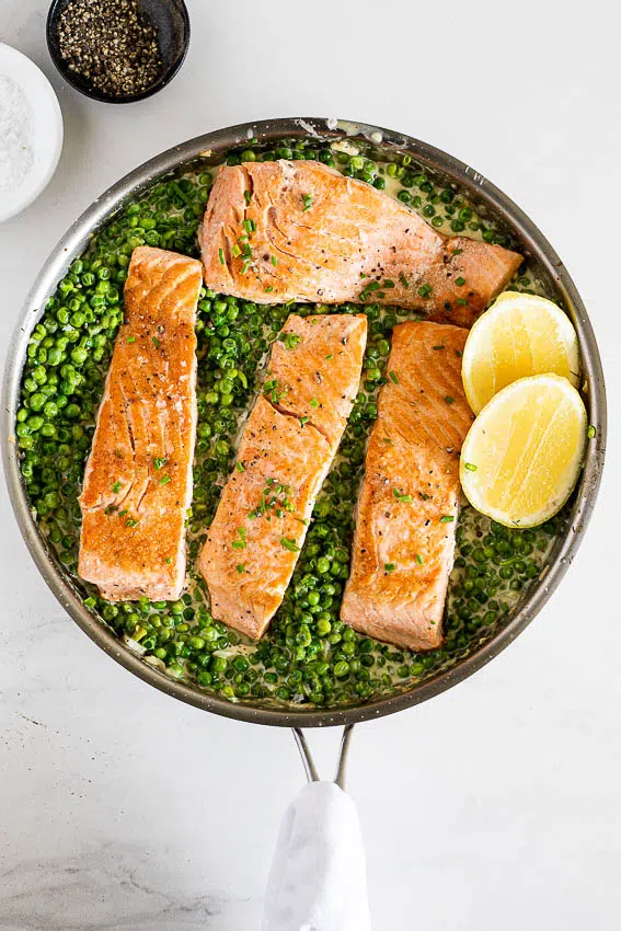 Juicy pan seared salmon is the easiest, healthy protein to cook for dinner. It’s versatile and delicious with almost any side dishes but served with creamy peas it’s the perfect one pan dinner recipe.