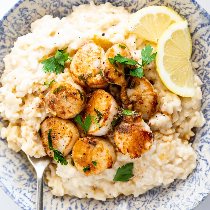 Pan fried scallops with white wine garlic sauce is an easy and delicious recipe, perfect for a date night in. Serve with crusty bread to mop up the sauce or over creamy lemon risotto for a showstopping dinner.