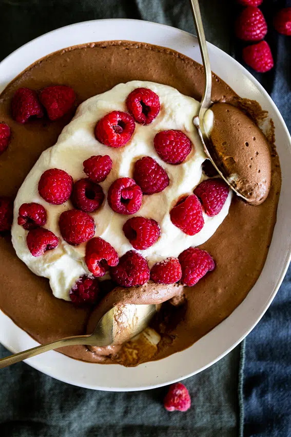 - Top the chocolate mousse with whipped cream and fresh raspberries then serve.