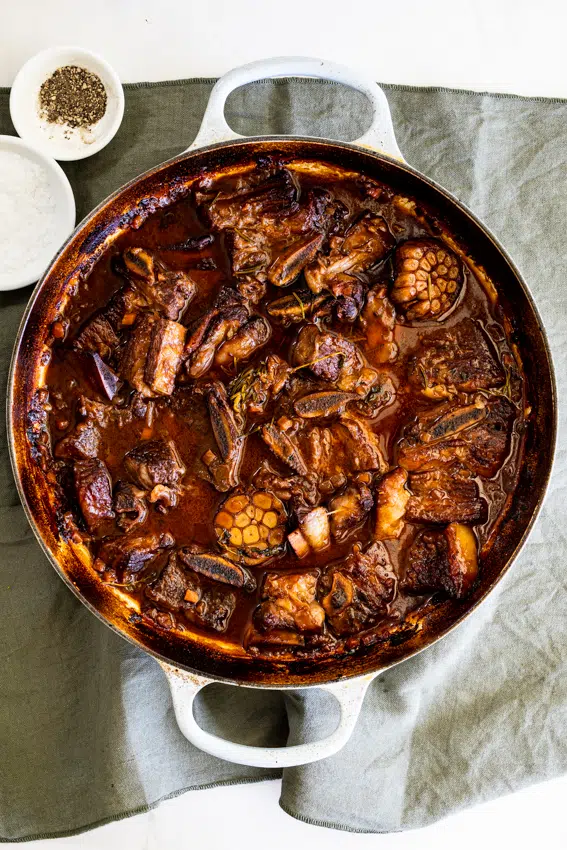 - Reduce and finish: Once the short ribs are cooked, remove the pot from the oven. Remove the ribs from the sauce and set aside. Strain out the solids then return the cooking liquid to the pot. Over medium heat, allow to come to a boil then reduce the heat and simmer for 15 minutes until the sauce has reduced a little. Adjust the seasoning by adding a spoon of sugar, salt or pepper if necessary then add the ribs back to the sauce.