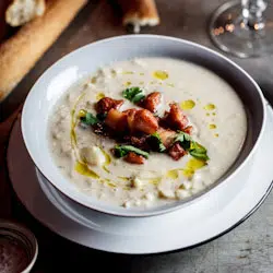 - Season with salt & pepper and serve with a drizzle of truffle oil and bacon lardons.