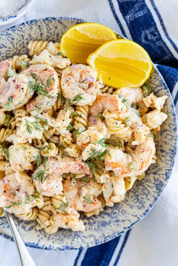 This shrimp pasta salad recipe is packed with flavor and perfect for picnics, potlucks or barbecues.