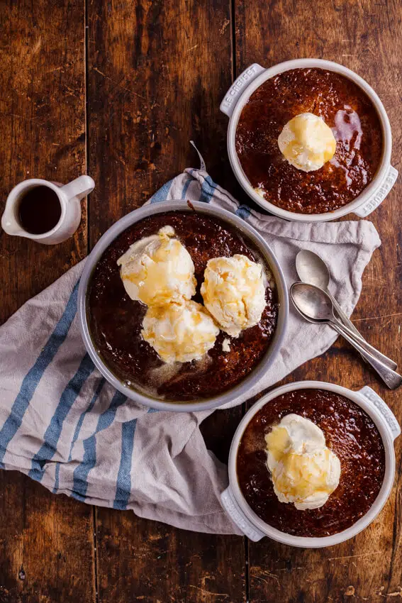 - Bake for 30-45 minutes until the pudding dark brown and baked through (a skewer inserted should come out clean).