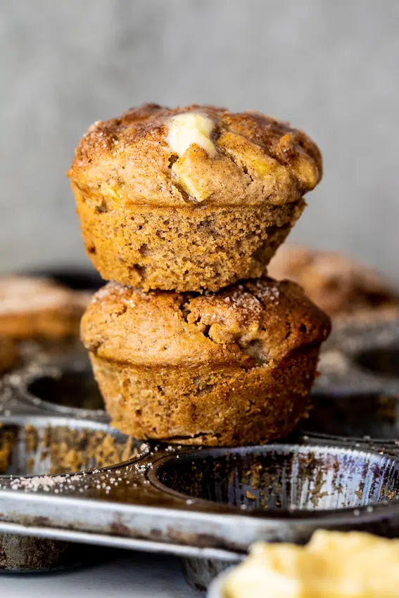 These easy, healthy-ish apple muffins spiced with cinnamon, ginger and all spice served with honey butter are a delicious fall breakfast or snack.