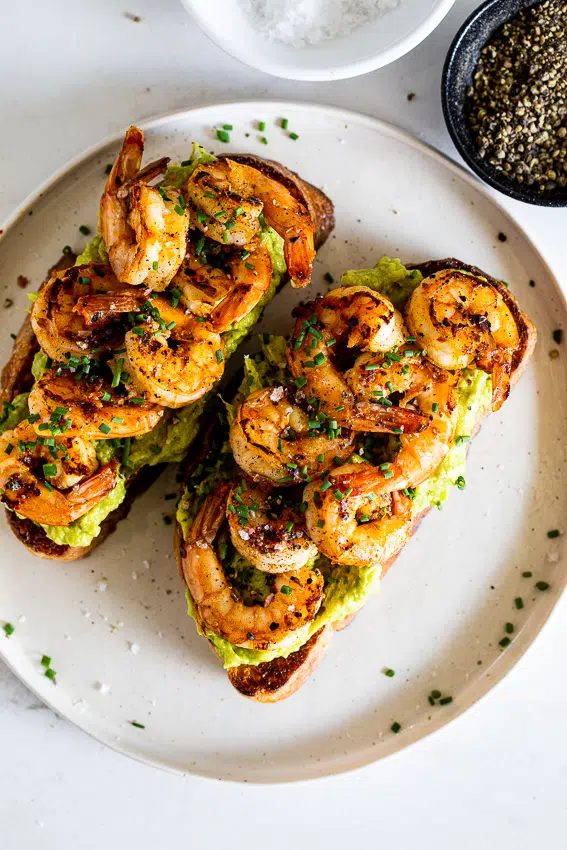 - Spread a generous amount of avocado on each slice of bread then top with the shrimp.