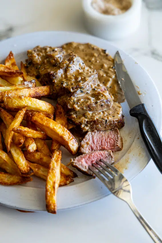 Steak au Poivre goes best with crispy fries and I like to make my air fryer fries as an easy side dish. However, any potatoes are delicious with a steak. A lemony side salad is also a great idea.