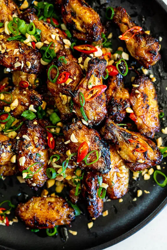 - To serve, top the chicken wings with the peanuts, finely chopped chillies and spring onion/green onion.