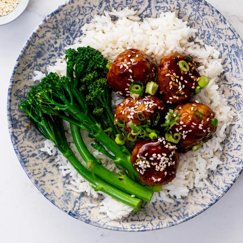 Juicy teriyaki chicken meatballs cooked in sticky sauce will become a family favorite in no time. Perfect served with rice and greens for easy dinners.