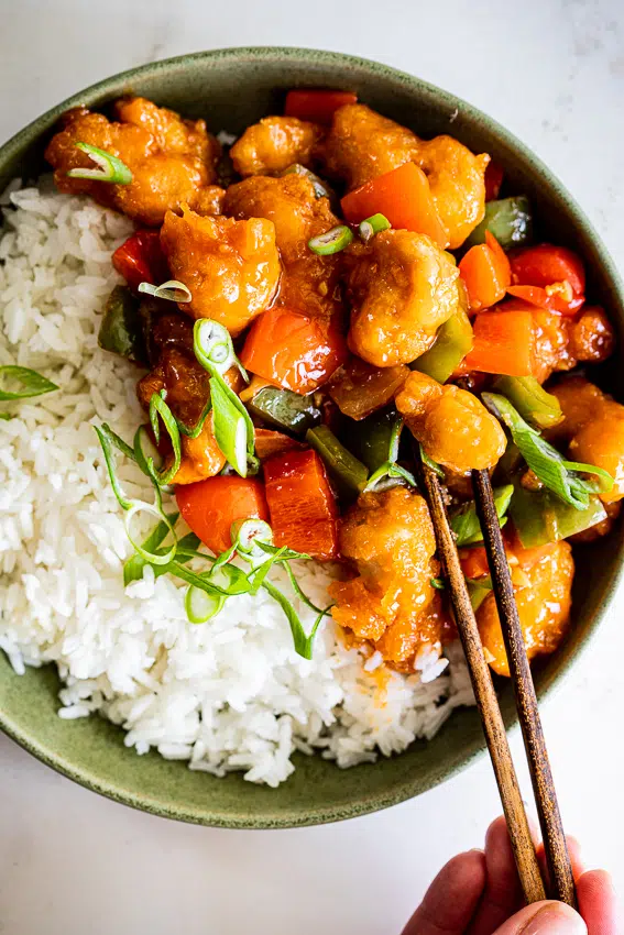 For a classic sweet and sour chicken recipe, the chicken is usually coated in batter and then fried until crisp and golden. However, once mixed with the sweet and sour sauce, the coating absorbs the sauce and softens. To keep the chicken crispy, I suggest coating it in a cornstarch mixture (like in my orange chicken recipe). I have given you both methods below so you can choose which way you would like to prepare the chicken.