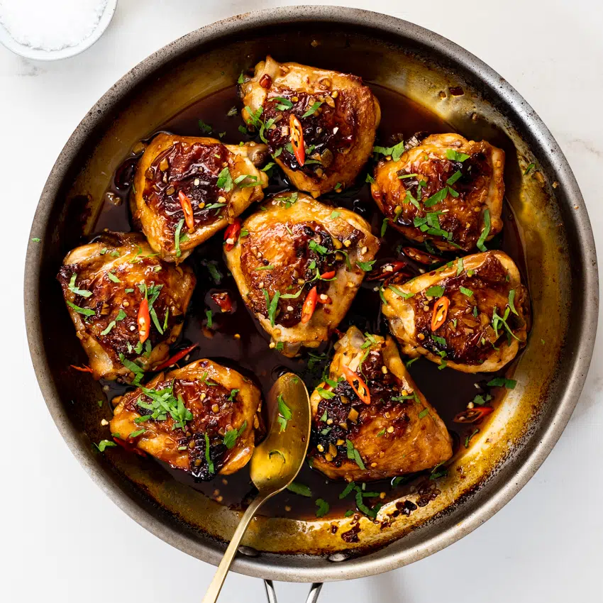 - Brown the thighs: Pat the chicken thighs dry with paper towels and season with salt on both sides. Place the chicken thighs, skin-side down, in a large oven-safe frying pan. Place the pan over medium heat and allow to cook for 7-10 minutes until the skin is golden brown and crisp. Flip the thighs over and pour in the sauce and baste the chicken thighs.